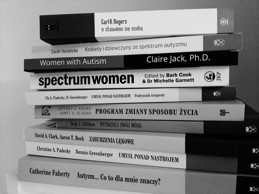 Na początku były to książki stricte związane z Zespołem Aspergera i autyzmem. Czytałam wiele biografii osób autystycznych, opracowań naukowych, „klasyków” ASD, podręczników dla rodziców, terapeutów, dorosłych itp. Kiedy już zebrałam wiedzę o ASD, wróciłam do książek ogólnych, które dotyczą problemów, z którymi muszę się mierzyć na co dzień. Niezrozumiałych emocji. Lęku i paniki. Relacji z ludźmi. Złości. Stanów psychicznych, których nawet nie umiem nazwać.